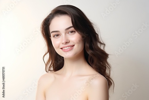 Obraz premium Portrait of a happy, confident, and healthy Caucasian woman with glowing skin and positivity. Generative AI