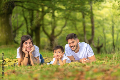 © unai, Fototapeta premium Portrait of a happy family lying on the grass