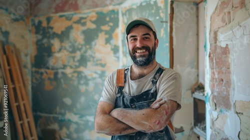 © sirisakboakaew, Fototapeta premium Portrait of a happy man, a skilled worker, standing and smiling while renovating a home. Handyman is dedicated to job, ensuring professional work and service with a happy demeanor.