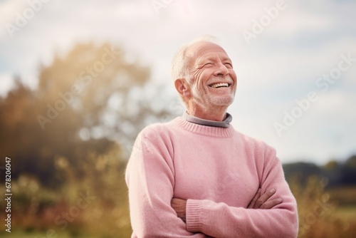 © CogniLens, Obraz premium Portrait of a happy man in his 70s wearing a thermal fleece pullover against a pastel or soft colors background. AI Generation