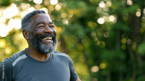© Dirk, Fototapeta premium Portrait of a happy senior African American man running outdoors, wearing a t-shirt and smartwatch on his wrist, enjoying a sport activity for good health at the park. Eldery man running outdoors, hea