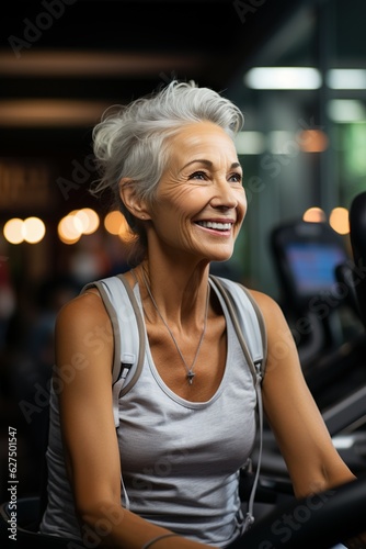 © Kay, Fototapeta premium Portrait of a happy senior woman exercising in the gym | Generative AI