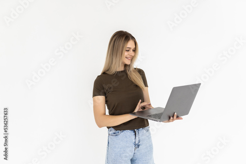 © dianagrytsku, Naklejka premium Portrait of a happy woman holding laptop computer while sitting on a floor over white background
