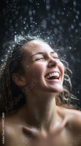 © ColdFire, Obraz premium Portrait of a happy woman in a shower. Generative AI