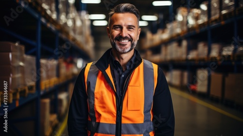 Fototapeta premium Portrait of a happy worker standing in warehouse distribution center.