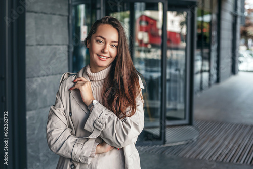 Fototapeta premium Portrait of a happy young woman against the background of an office building