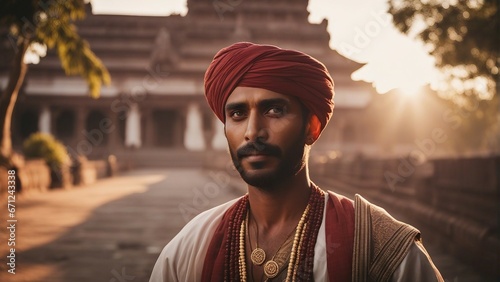 © abu, Fototapeta premium portrait of a Hindu man at sunrise in front of the temple, wearing traditional clothes