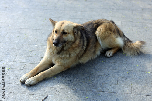Naklejka premium Portrait of a homeless dog sitting on the ground
