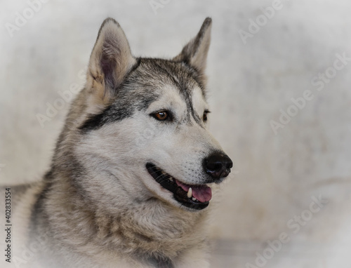 Fototapeta premium Portrait of a husky dog against a grey background with copy space