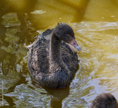 © nndanko, Fototapeta premium Portrait of a juvenile black swan cygnet swimming in muddy water. Young bird in natural wildlife setting