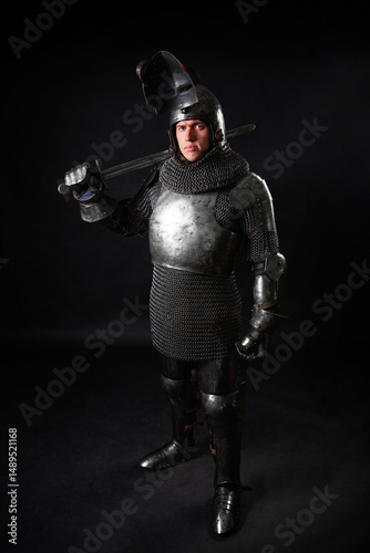 Naklejka premium Portrait of a knight in full plate armor holding a sword posing isolated on a dark background