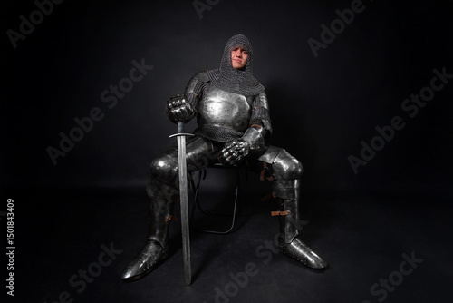 Naklejka premium Portrait of a knight in full plate armor holding a sword posing sitting on chair isolated on a dark background.