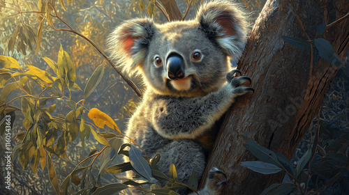 Obraz premium Portrait of a koala peacefully clinging to a eucalyptus tree in the...