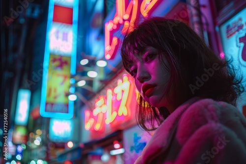 Obraz premium portrait of a korean girl at night of the neon street at the downtown in Tokyo