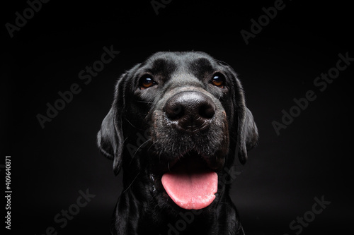 Fototapeta premium Portrait of a Labrador Retriever dog on an isolated black background.