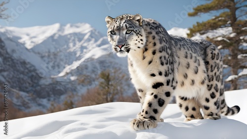 © monu, Naklejka premium portrait of a leopard background of snowy mountains