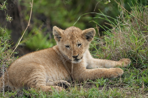 Naklejka premium portrait of a lion cub isolated young in the serengeti national park tanzania