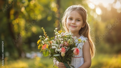 Fototapeta premium Portrait of a little girl with a bouquet of spring flowers on the background...