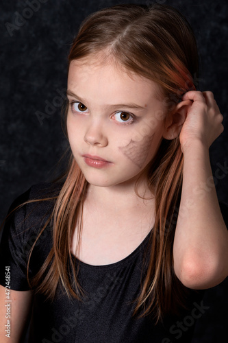 Obraz premium Portrait of a little girl with a spider web drawing on her face.