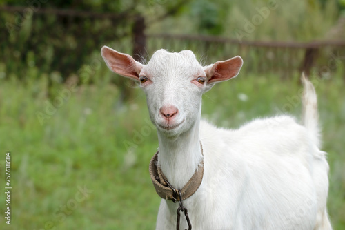 Fototapeta premium Portrait of a little white goat. Cute with funny. Soft sunlight.