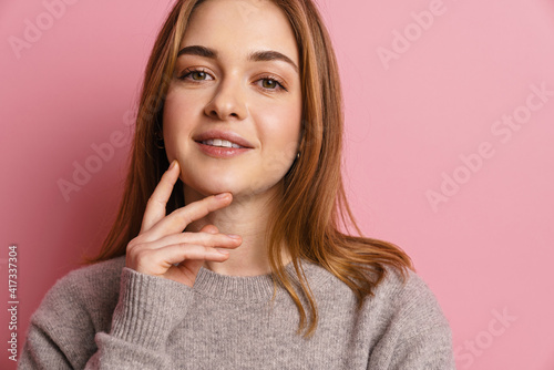 Fototapeta premium Portrait of a lovely attractive young girl isolated over pink