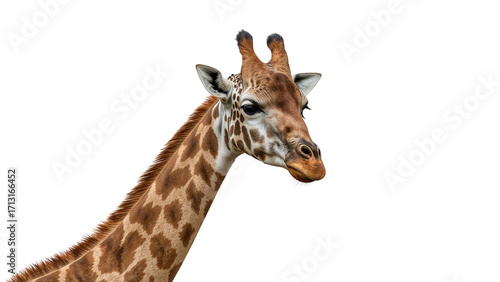 © PrismPNG, Fototapeta premium Portrait of a majestic giraffe with its distinctive spotted coat and elegant, elongated neck. Isolated on transparent background, png