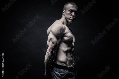 © markhipov, Naklejka premium portrait of a male bodybuilder, straining muscles in sports poses, on a black background is isolated. monochrome. The concept of a photo of competing sports, health, fitness