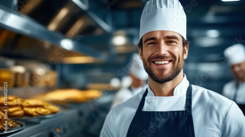 Fototapeta premium Portrait of a Male Chef Smiling in Bakery with Team in the Background