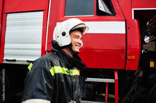 © amixstudio, Fototapeta premium Portrait of a man, a firefighter, an Asian-Kazakh at work