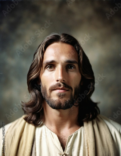 © Julija, Fototapeta premium Portrait of a Man Dressed as Jesus. White robe. Long brown hair and beard. Man appears to be in his early 30s, and he has a serious expression on his face. Christian religion and faith. AI