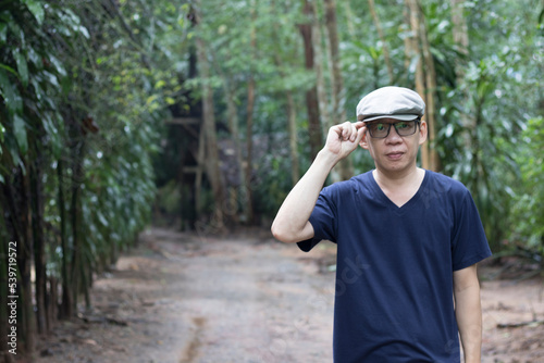 © Monta, Obraz premium Portrait of a man enjoying walking in the woods agritourism, Slow life concept, vacation lifestyle alone.