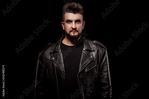 © Kaminski Vadim, Naklejka premium portrait of a man in a leather jacket and in the studio on a black background