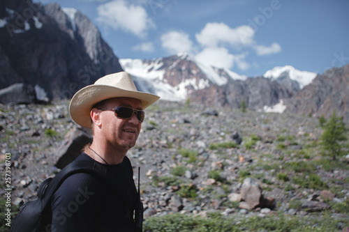 © olga_polyanskaya, Naklejka premium Portrait of a man in sunglasses and a hat with a walkie-talkie. Extreme trip to the mountains