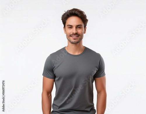 Fototapeta premium portrait of a man wearing grey t-shirt on white background