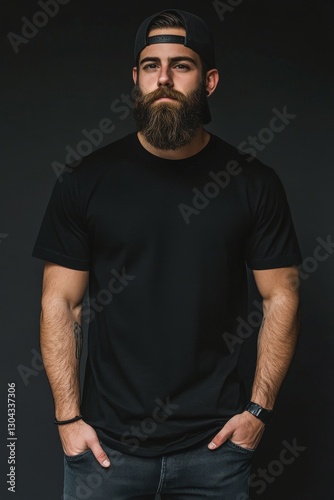 Naklejka premium Portrait of a man with a beard wearing a black t-shirt and cap