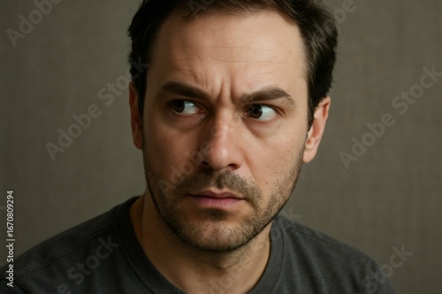 © Татьяна Евдокимова, Fototapeta premium Portrait of a man with a suspicious expression glancing sideways with distrust and concern, expressing anxiety and worry