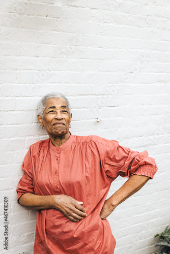 © Lisa Weatherbee, Naklejka premium Portrait of a mature black woman standing confidently against a brick wall
