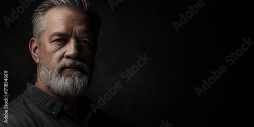 © J. Grayscale, Obraz premium Portrait of a Mature Man with a Beard in Dramatic Lighting