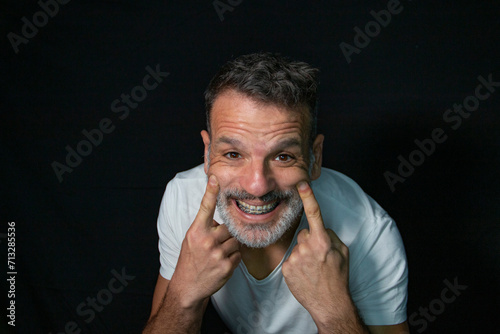 © SaucE ReQuEs, Fototapeta premium Portrait of a mature man with a gray beard, wearing braces, gesturing with his hands, wearing white t-shirt on a black background.