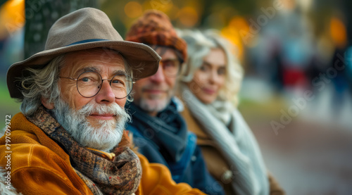 Fototapeta premium Portrait of a mature man with glasses, beard and hat looking directly at the camera accompanied by friends