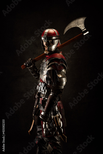 Naklejka premium Portrait of a medieval fighter carrying an ax over his shoulder