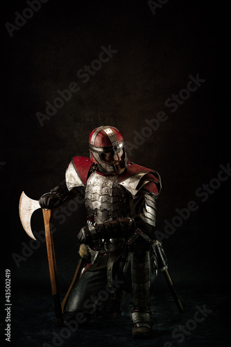 Naklejka premium Portrait of a medieval fighter kneeling, holding an ax