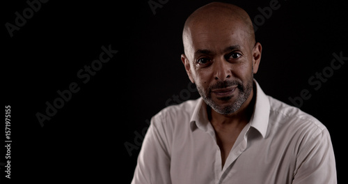 © 4kclips, Fototapeta premium Portrait of a middle aged African American man wearing a white shirt on a black background