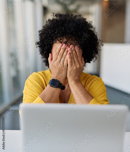 Obraz premium Portrait of a middle aged mature businesswoman sitting at table with laptop computer in the office, with headache, sick, tired or fatigue while working late . Burnout, stress and deadline concept