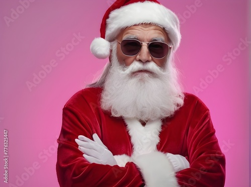 © NoblePix, Naklejka premium Portrait of a modern elderly Santa Claus with sunglasses and piercing. Pink background. Generative AI