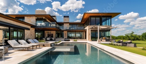 Fototapeta premium Portrait of a modern house equipped with a swimming pool. generative AI image