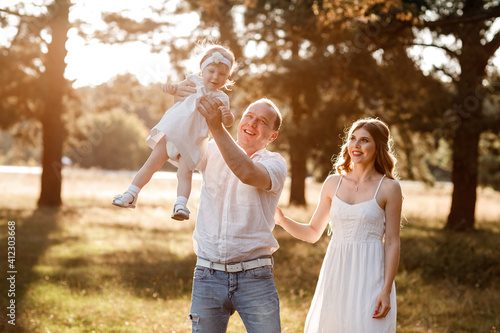 © Andriy Medvediuk, Fototapeta premium Portrait of a mother, father holds, throws up and spins the daughter on hands walking on nature on summer day vacation. Mom, dad and girl playing in the park. Concept of happy family.