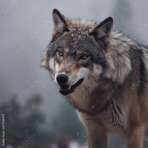 Fototapeta premium Portrait of a mountain wolf, face view, fog, forest, unusual background.
