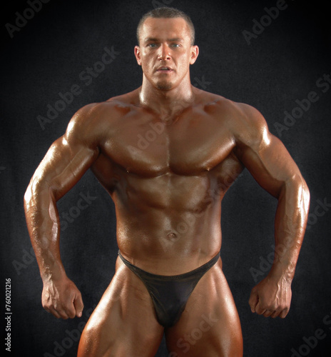 © baxys, Fototapeta premium Portrait of a muscular male bodybuilder on a dark background.