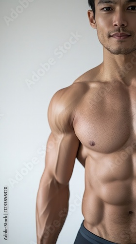 Fototapeta premium Portrait of a Muscular Man with Defined Chest and Strong Arms inStudio Setting